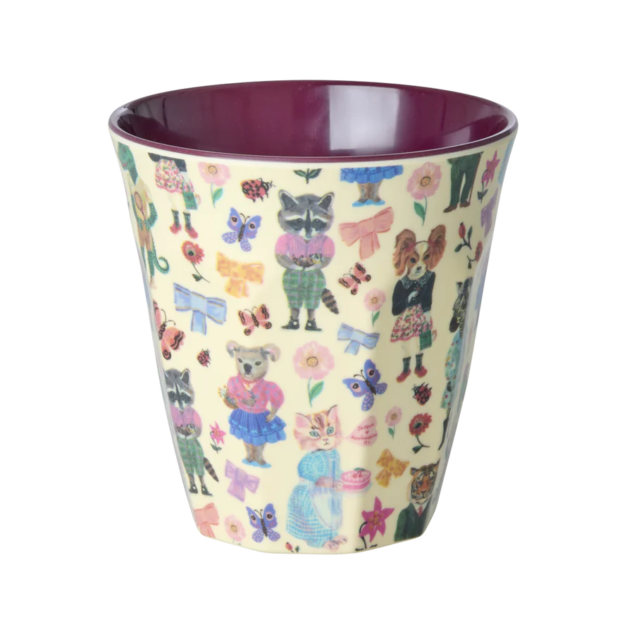 Nous craquons complètement pour cet imprimé dessiné par Nathalie Lété… des koalas cueillant des fleurs, des tigres en costume et des crocodiles jouant au tennis – tous imprimés sur un gobelet en mélamine, taille médium – SUPER adorable !