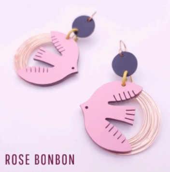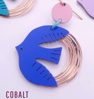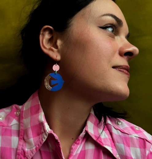 boucles Birdy, boucles d’oreilles formica, bijou artisanal français, Rose Bouchon, boucles dorées légères, bijou design, boucles colorées, bijou fait main, boucles fantaisie