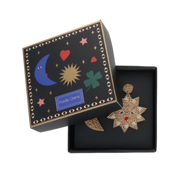 Design asymétrique : un soleil pour une oreille, une lune pour l’autre