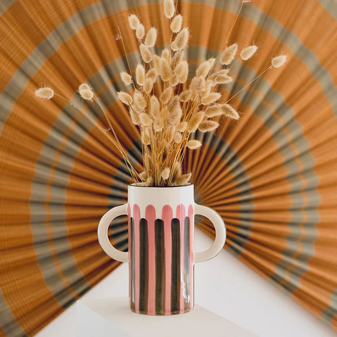 Le singulier. Avec ses deux grandes anses, notre vase habillera vos tables et étagères de la plus belle et originale des façons. Il accueillera parfaitement vos fleurs séchées ou pourra même se suffire à lui même pour un intérieur chaleureux et ensoleillé.