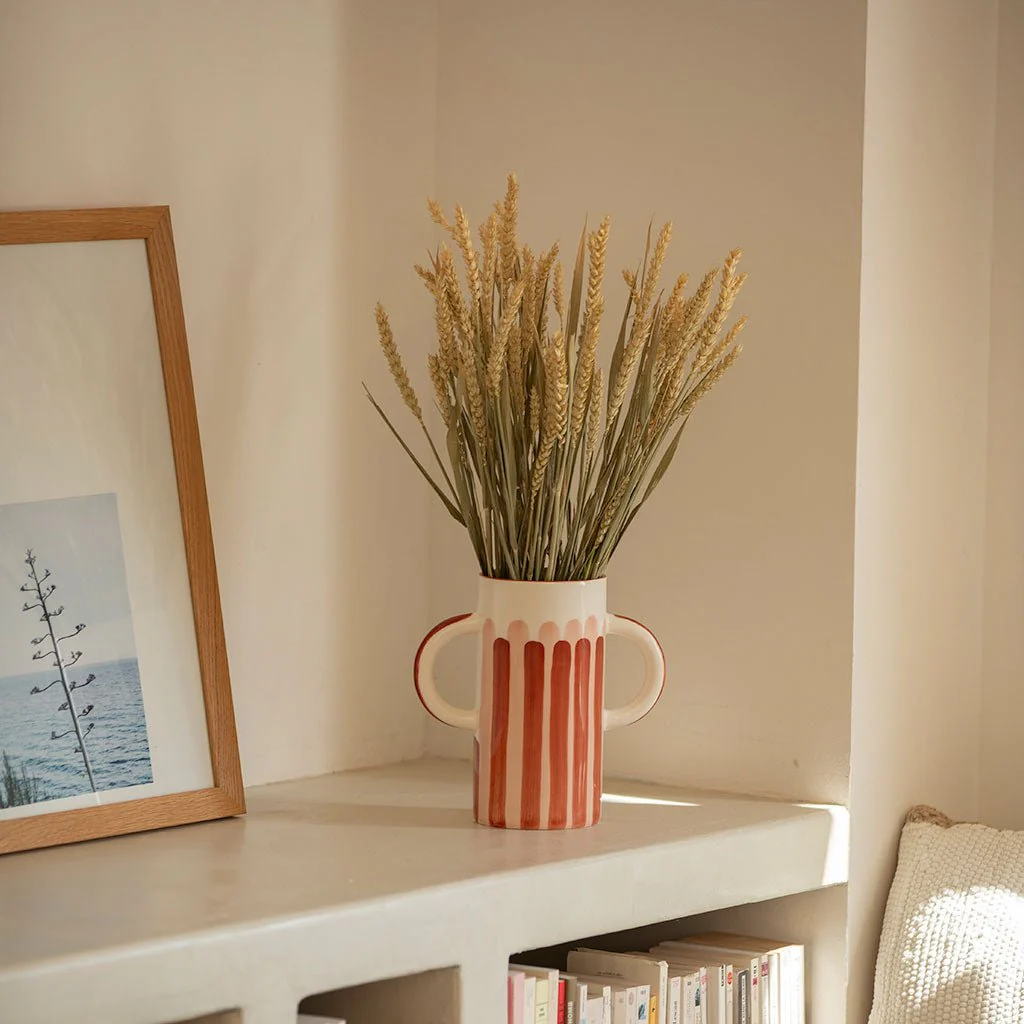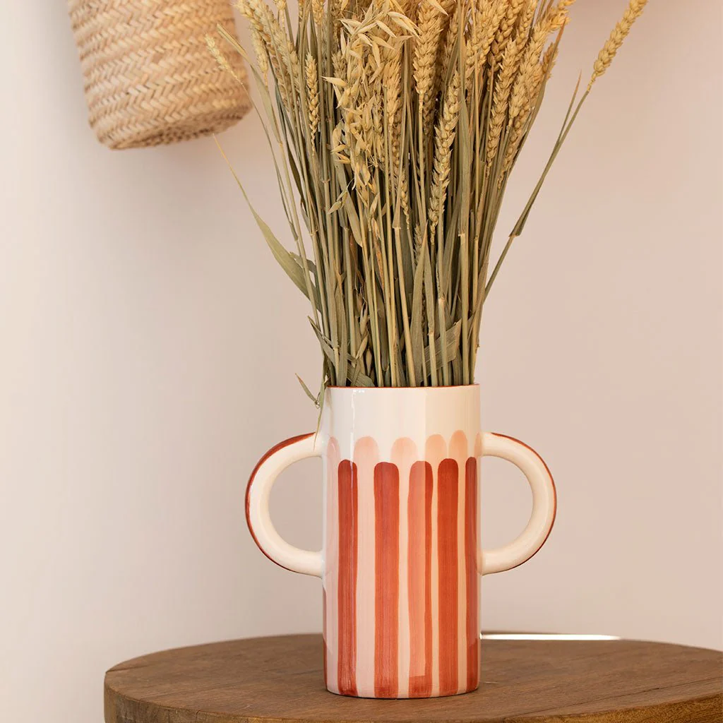 Le singulier. Avec ses deux grandes anses, notre vase habillera vos tables et étagères de la plus belle et originale des façons. Il accueillera parfaitement vos fleurs séchées ou pourra même se suffire à lui même pour un intérieur chaleureux et ensoleillé.