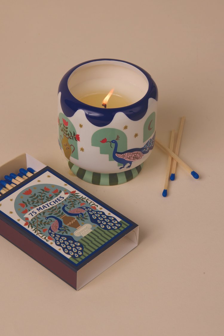 La Bougie avec un Paon à un parfum rafraîchissant, un design artisanal et un contenant réutilisable !
