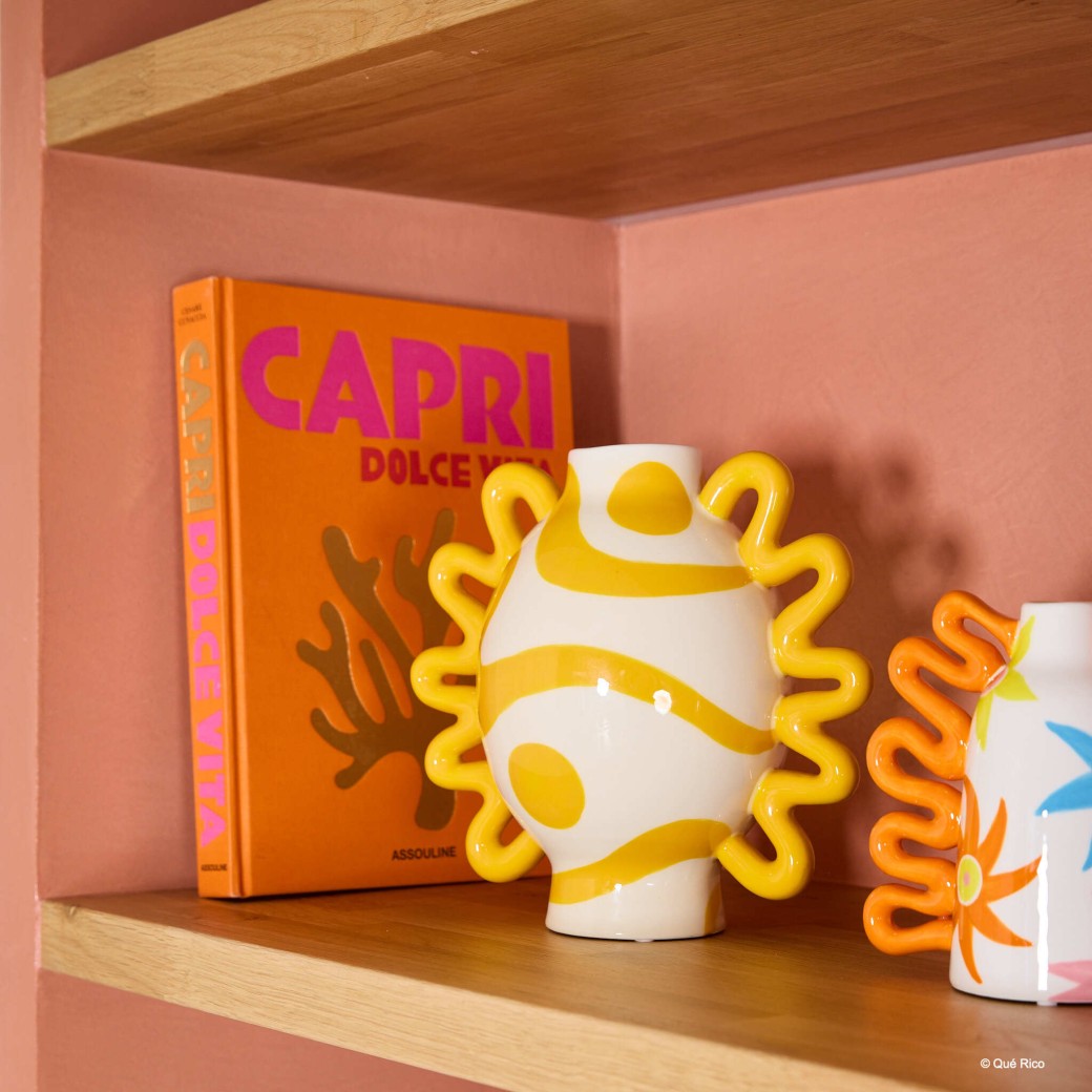 Sublimez votre composition florale avec le vase en céramique Isabel de Qué Rico. Ce vase de conception belge, inspiré du style de vie espagnol dynamique et orné de notre motif Sol y Sombra, apportera un rayon de soleil à votre intérieur. Avec sa forme organique, ses anses originales et son magnifique motif jaune, ce vase fait main attirera tous les regards dans tous les intérieurs. Peint à la main, chaque pièce est unique !